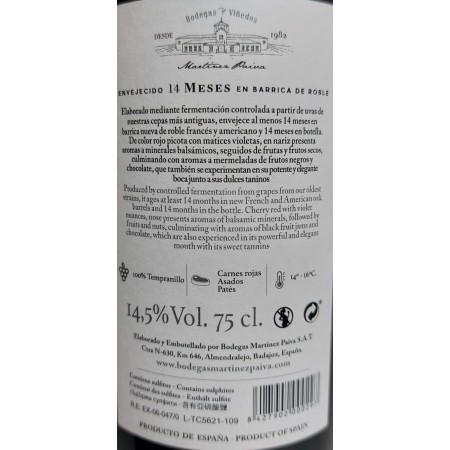 Este vino tinto, elaborado con uvas 100% Tempranillo, es un ejemplo de calidad y dedicación. Con un envejecimiento de 14 meses en barricas de roble francés y americano, seguido de un redondeo en botella durante otros 14 meses, este vino alcanza un equilibrio perfecto entre intensidad y elegancia. Un vino de gran calidad, ideal para una cena especial o simplemente para disfrutar con tranquilidad.